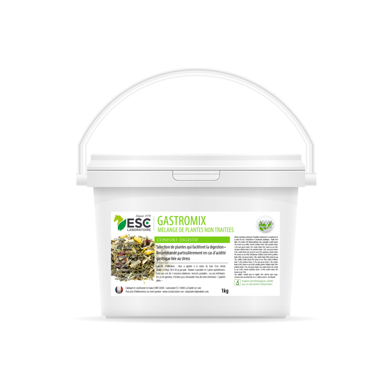 Gastromix est un mélange de 10 plantes sélectionnées pour leurs propriétés apaisantes sur l’appareil digestif du cheval : ARGILE- CAMOMILLE – CHICOREE – FENUGREC – GUIMAUVE – LITHOTHAMNE – MELILOT – MELISSE – MENTHE POIVREE – VERVEINE. Cette formule a été élaborée par notre Laboratoire.