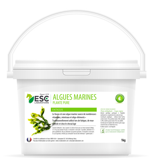 Les algues marines pour chevaux (fucus) sont des végétaux marins source de nombreuses vitamines, minéraux et oligo-éléments. Elles sont traditionnellement utilisées lors de fatigue, de mue difficile et chez le cheval âgé. Les algues marines ESC Laboratoire proviennent de France (Bretagne).